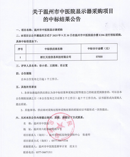 關于溫州市中醫院顯示器采購項目的中標(成交)結果公告
