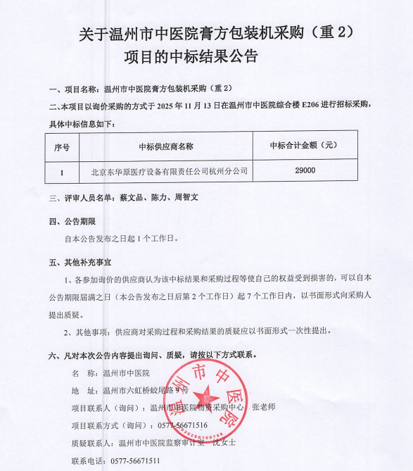關(guān)于溫州市中醫(yī)院膏方包裝機采購項目(重2)的中標(成交)結(jié)果公告
