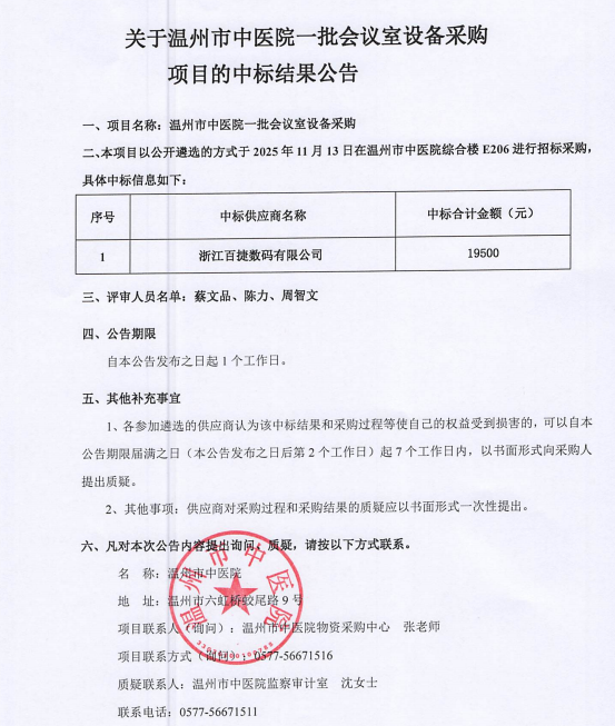 關(guān)于溫州市中醫(yī)院一批會議室設(shè)備采購項目的中標(成交)結(jié)果公告
