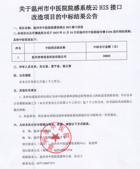 關(guān)于溫州市中醫(yī)院院感系統(tǒng)云HIS接口改造項目的中標(成交)結(jié)果公告