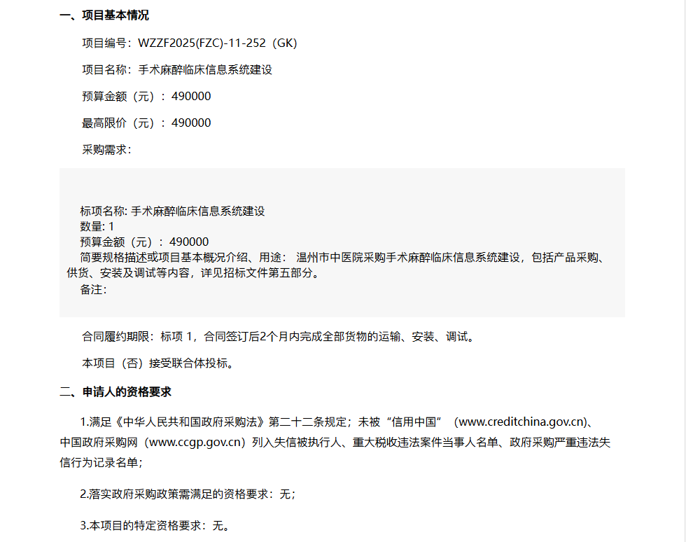 關(guān)于溫州市中醫(yī)院手術(shù)麻醉臨床信息系統(tǒng)建設(shè)項目的公開招標公告