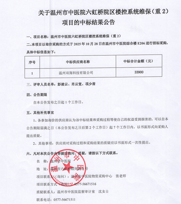 關于溫州市中醫院六虹橋院區樓控系統維保(重2)項目的中標(成交)結果公告