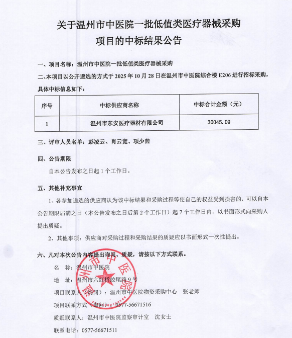 關于溫州市中醫院一批低值類醫療器械采購項目的中標(成交)結果公告