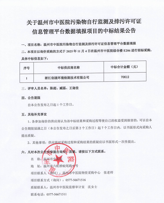 關于溫州市中醫院污染物自行監測及排污許可證信息管理平臺數據填報項目的中標結果公告