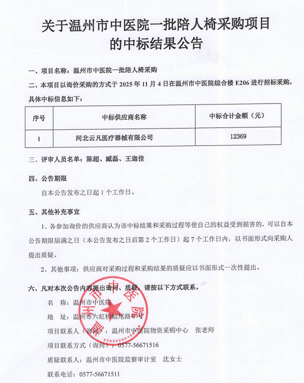 關于溫州市中醫院一批陪人椅采購項目 的申標結果公告查看詳情+