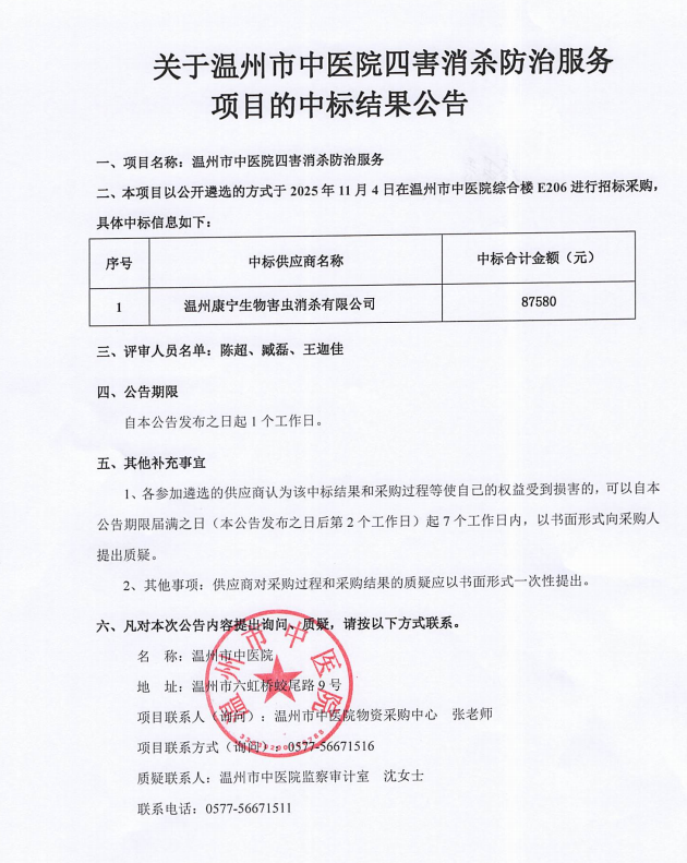 關于溫州市中醫院四害消殺防治服務項目的中標結果公告